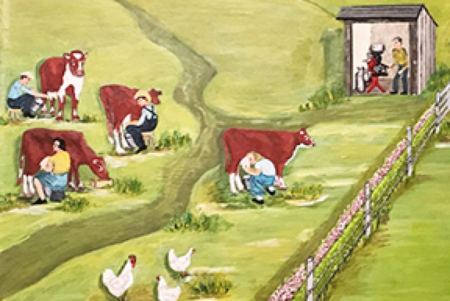 Yakimyshyn’s painting Cream Cheque and his “story board’ offers up a intimate look at rural life in the ‘40s.