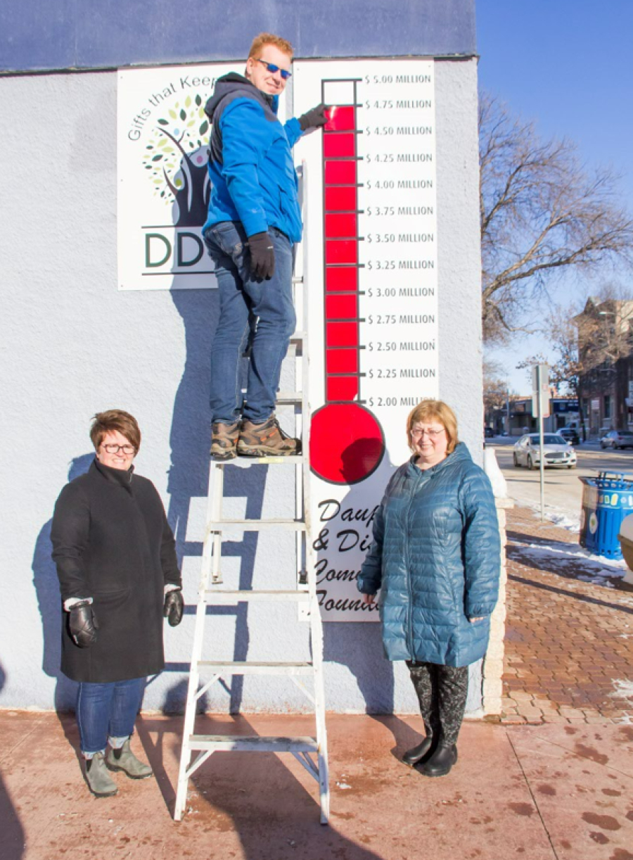Dauphin and District Community Foundation members Sherrie Volk, left, and Rita Dupley, right, were on hand when fellow board member Darren Eddie marked another milestone on the foundation’s thermometre, last week.