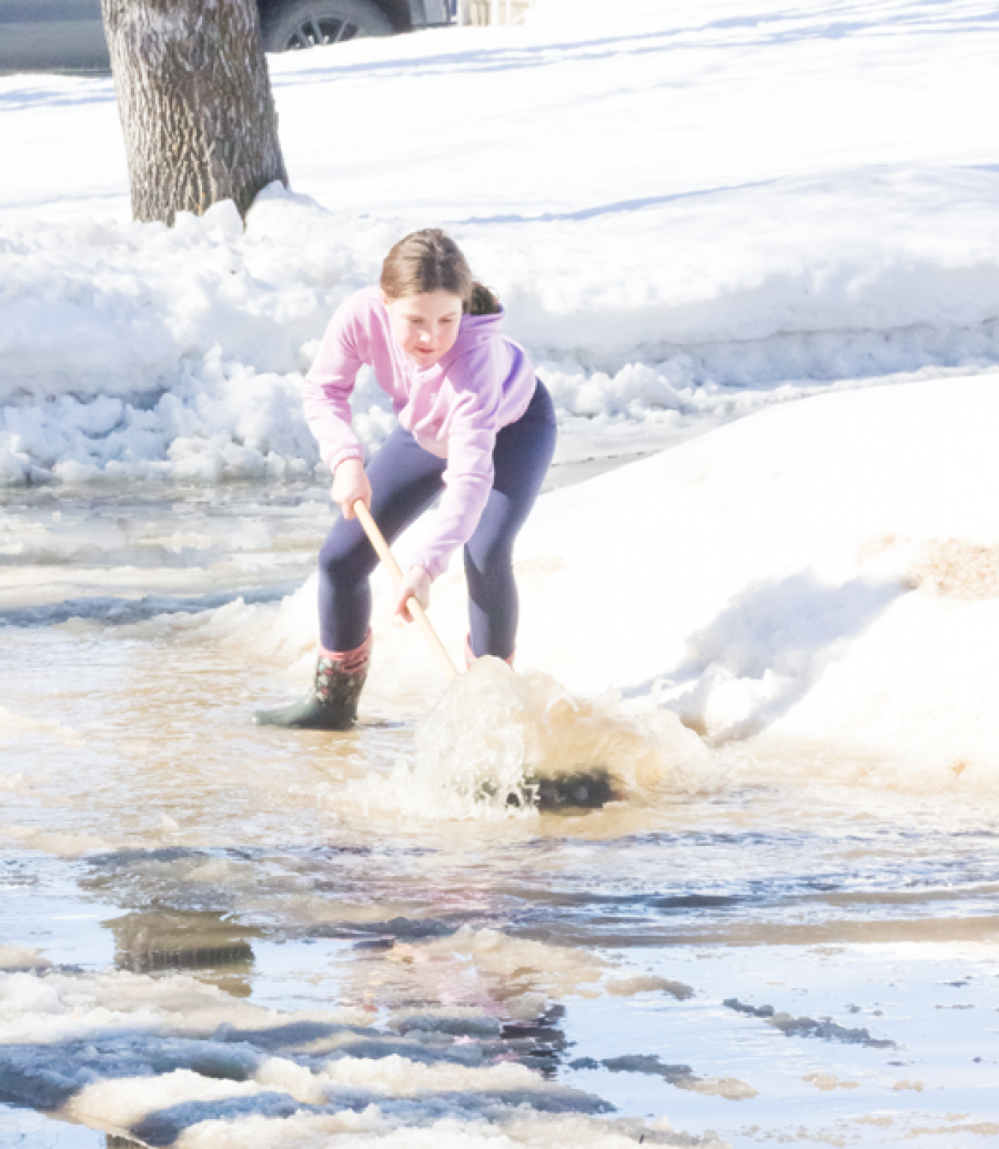 Sylvie Telfer, 11, uses a broom to push melted snow towards a storm drain on Edward Ave., Saturday afternoon.