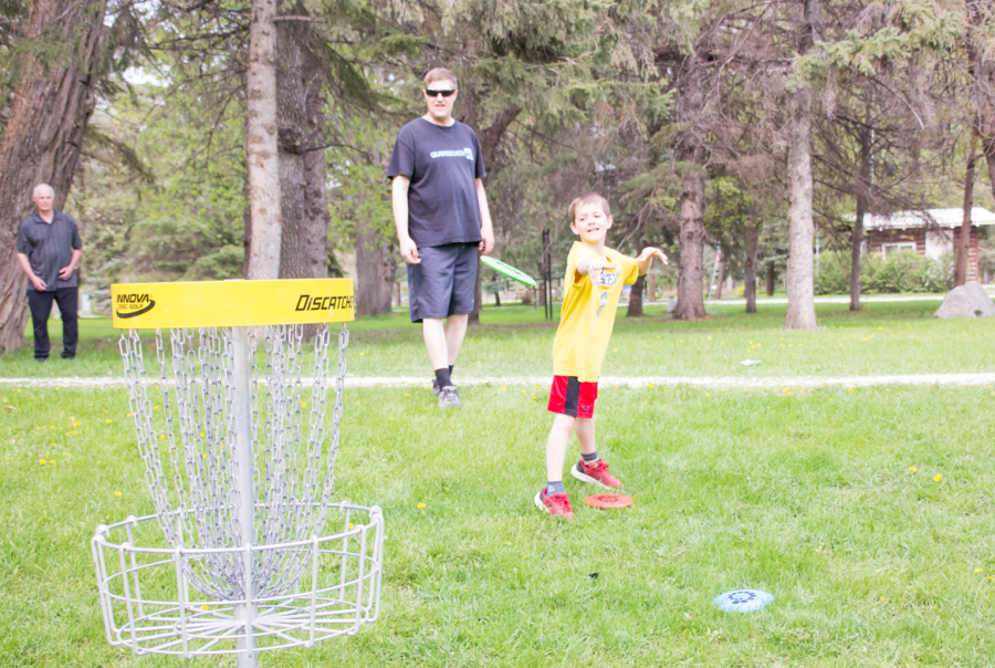 Eight-year-old Cohen Campbell takes aim at the target during a round of disc golf with his uncle Craig, Sunday afternoon.