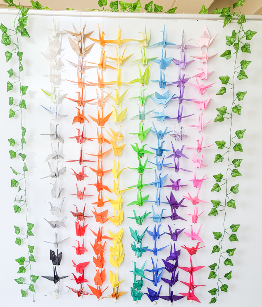 The students made origami cranes. In Japanese culture, the crane represents peace, long life and healing. The project in the photo above has eight rows with 16 cranes and is dedicated to the 16 people who lost their lives in the June 15 crash.