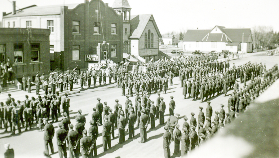 Local residents turned out in record numbers on the Saturday afternoon of Apr. 22, 1944, to watch 18-year old Canadian paratrooper, Private Fred “Sticky” Stokotelny, make a spectacular jump from a twin-engine Lodestar aircraft flying at 800 feet above the fairgrounds. Skilled in spot landing it took Private Stokotelny less than a minute to drop to the infield of the race track. Upon touchdown he disengaged himself from the parachute harness and did an “on the double” sprint to deliver Unit 38’s Victory Loan shield to Mayor Johnston.