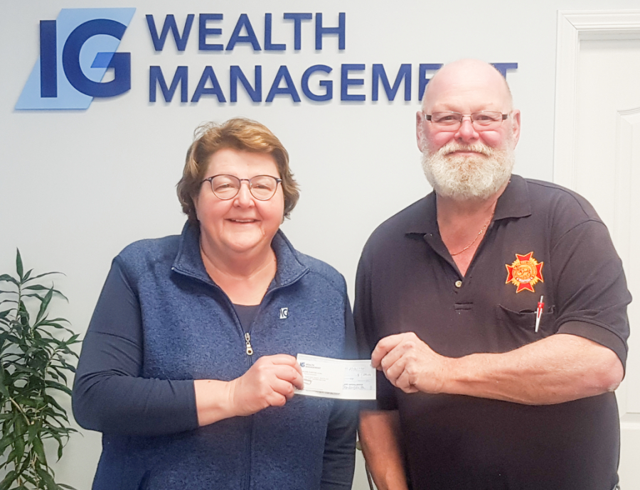 Sharlene Clinton of IG Wealth Management presents a cheque for $1,000 to Al Gray of the AIRPORTMEMORIAL80 Project.
