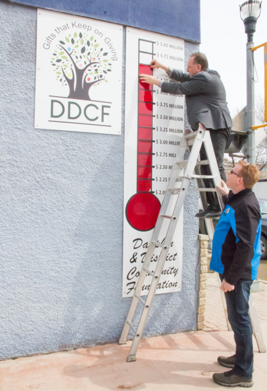 Dauphin and District Community Foundation board member Dan Ward recently added another marker to the foundation’s thermometer as fellow board member Darren Eddie looks on.