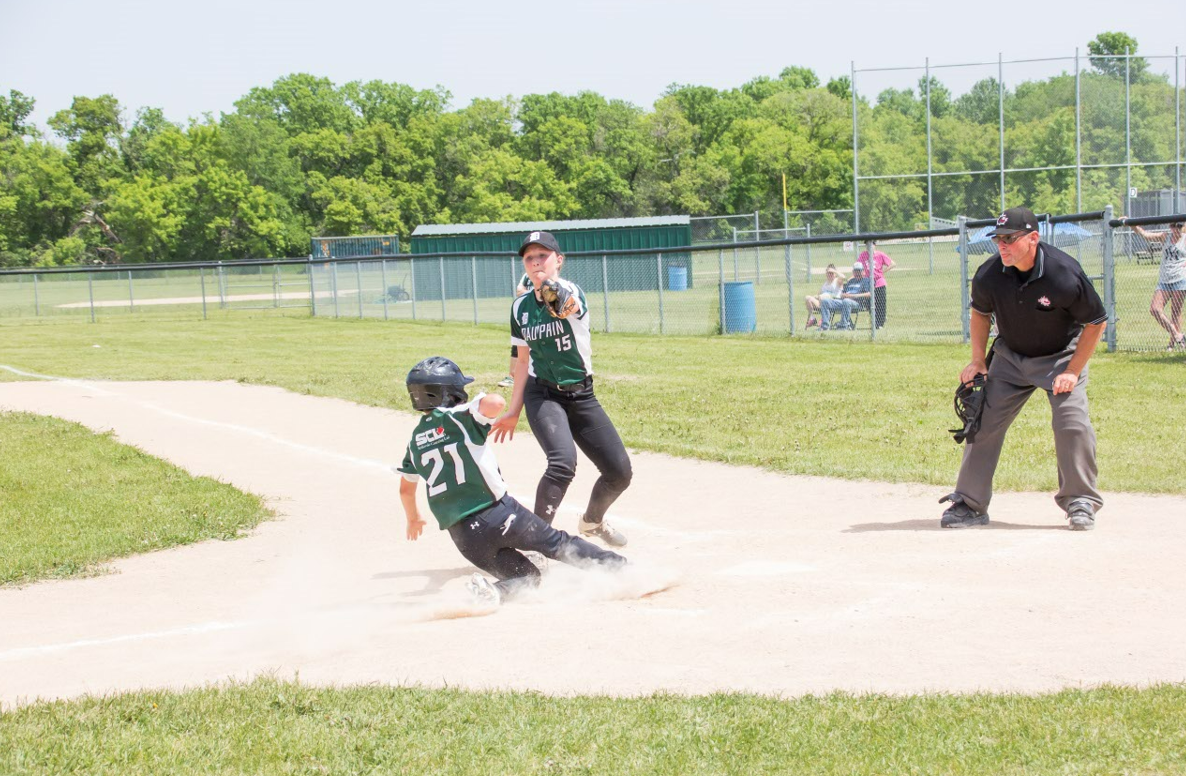 Below, Bohdi Bloomer of McMunn and Yates slides safely into home before Dauphin Reit-Syd Equipment’s Cameron Carefoot can make the tag in the A provincial qualifier, Sunday afternoon.