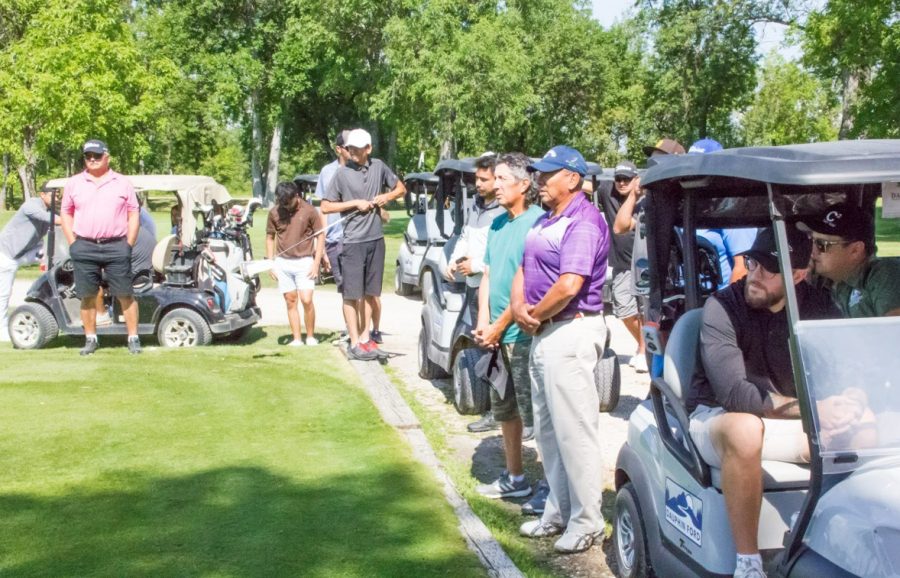 Golfers watch the opening ceremony at the Ebb and Flow Treaty Days two-person scramble, Friday, at the Dauphin Lake Golf Club, Friday.