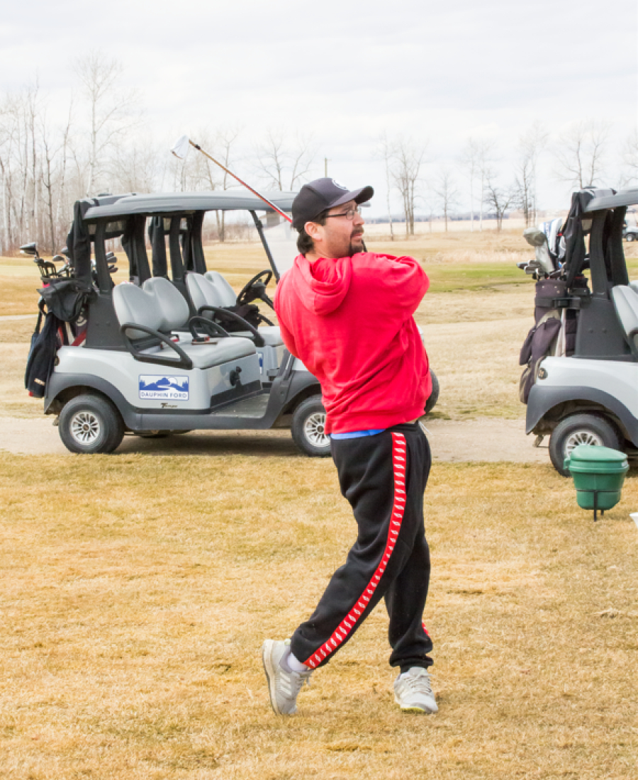 Earl Thompson tees off on no. 6 at the Dauphin Lake Golf Club, Friday, as the local course opened for business earlier than expected.