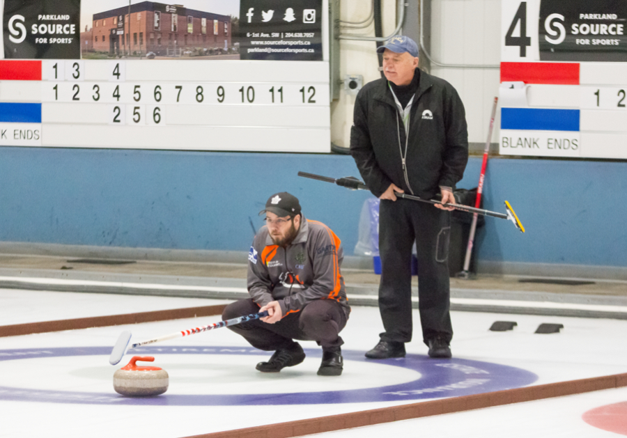 Kyle Forsyth of Turko Fertilizer and Glenn Toews of Nutrien Ag. Solutions track an incoming shot during the final of the Bayer Crop Science Parkland Super League of Curling, Sunday.