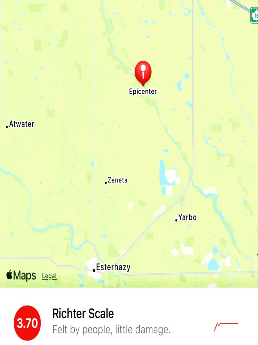 There was a 3.7 magnitude earthquake Sunday night in the Esterhazy area with people reporting significant shaking at around 11:08 pm followed by a smaller quake 29 minutes later. Seismic activity was recorded northeast of Esterhazy.
