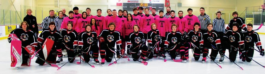 The Trojans and the Raiders have played against each other for the last five years in the fundraiser in aid of bringing chemotherapy treatment to the area. The Raiders raised $500 which was presented at the game. (Below) Josh Edwards, captain of the Major Pratt Trojans and Kael Maxwell of the Roblin/Grandview/Gilbert Plains Raiders met Dr. James Honiball and Cancer Care nurses Danielle Beischer and Lisa Derkach at centre ice for the official puck drop for the Trojans annual cancer hockey game. (Left) Astrid and Reese enjoyed the annual cancer game with family and friends.