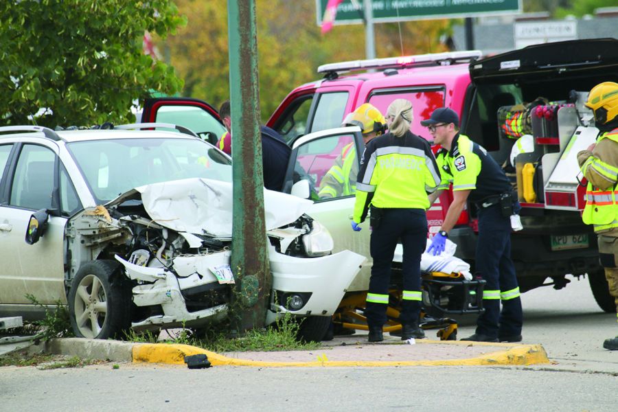 The Swan Valley Fire Department (SVFD), along with Swan River RCMP and Shared Health Emergency Medical Services, were dispatched to a Vehicle Collision in front of Giant Tiger on Friday (Sept. 19) at 4:27 p.m.. Crews arrived on scene to find one vehicle that collided into a tree and light post with a lone occupant inside. SVFD crews disconnected the battery to the vehicle and put water under the engine compartment to ensure no fire started. Another vehicle was damaged and no occupants were in that vehicle. One patient was transported to hospital. The SVFD was back in service at 5:30 p.m.. Pictured here, first responders work together to extricate the lone occupant of the vehicle. (INSET) Another vehicle part of the emergency scene sustained damage to the drivers’ side, albeit much less damage than the other vehicle being attended to.