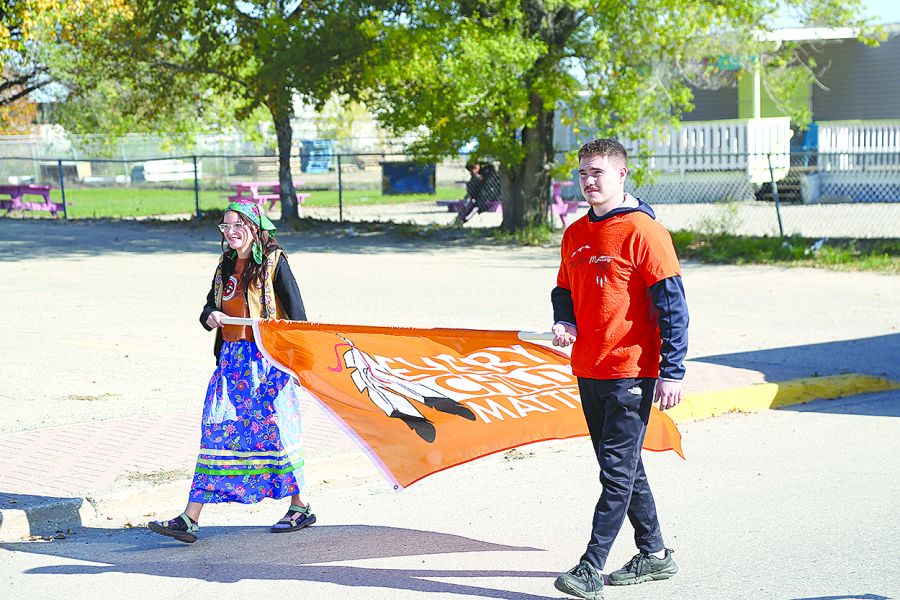 National Day for Truth and Reconciliation was held last Tuesday (Sept. 30) at the Elbert Chartrand Friendship Centre, in honour of Residential School survivors, and those who did not return home. The event presented speeches from survivors Fred Stevens and Dennis Chartrand who told of their experience at residential schools, followed by a walk down Main Street. Pictured here, Amber Stevens (left) and Josh Tripp (right) walk ahead of the group holding the “Every Child Matters” flag.