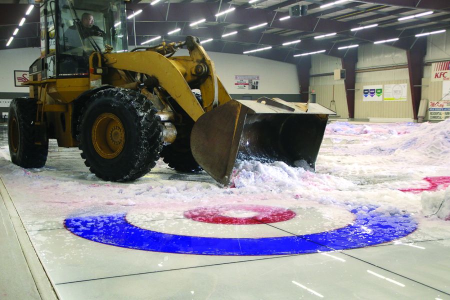 The last curling event at the Swan River Community Centre took place on Wednesday (March 18), and thanks to the warm, melting weather, the ice was ready to take out on Friday (March 20) – the first official day of spring – an apropos symbol of the changing seasons. Pictured here, a rented loader service from Cook Bros. Cartage cleans up the painted slush.