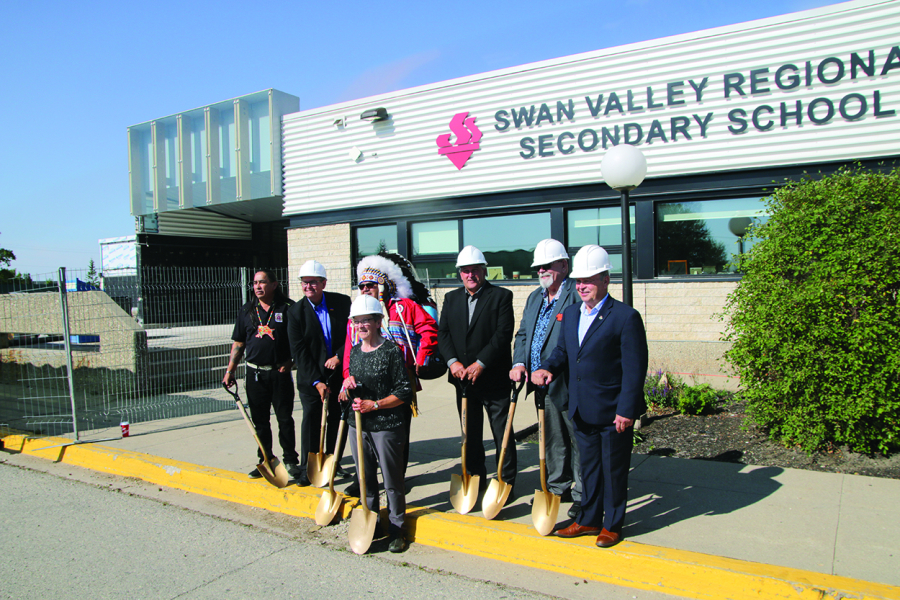 Representatives of the various contributors, stakeholders and consultants “break ground” on the new $15-million+ multi-purpose room and performing arts centre at the SVRSS, which has already commenced construction behind them...