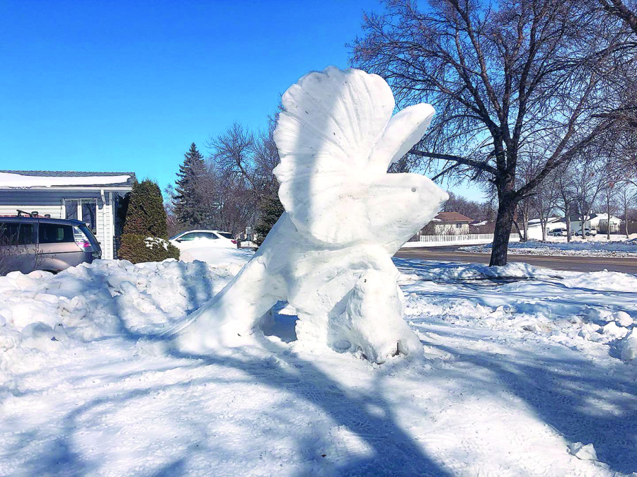 Winter almost came and went without Swan River sculptor Derryl May crafting another creation in his front yard, with last week’s precipitation providing a medium to erect a representation of an osprey catching a fish, which melted down somewhat and re-envisioned into a chickadee. Here, the final result before the above-freezing temperatures melted it further.