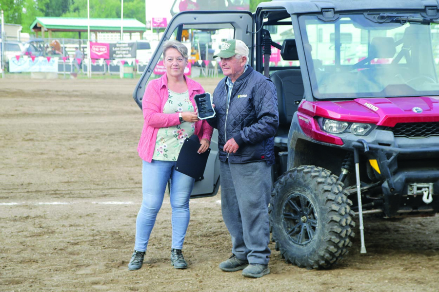 NorthWest Round-up and Exhibition volunteer and chuckwagon track expert Augie Rausch was honoured with a Lifetime Member of the Manitoba Association of Agricultural Societies during this year’s event. Swan River Valley Agricultural Society Vice President Lesley Sembaluk presented Rausch with the award.